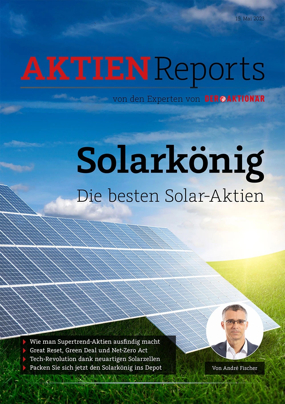 In seinem neuen Aktien-Report „Solarkönig“ stellt André Fischer zwei dieser Schlüsselanbieter vor. Die erste Solarfirma hat sich in den Bereichen Photovoltaik, Batteriespeicher und Energiemanagement die Technologieführerschaft erarbeitet und besticht durch ein Gewinnwachstum von 50 Prozent. Die zweite Firma ist die Hauptempfehlung im Report. Dieser Anbieter wartete bei der Produktion von Solarzellen zuletzt mit einem Technologiesprung auf, der vergleichbar ist mit dem Übergang von 4G auf 5G im Mobilfunk. Das potenziell revolutionäre Produkt könnte sich demnächst zum Goldstandard der Branche entwickeln.