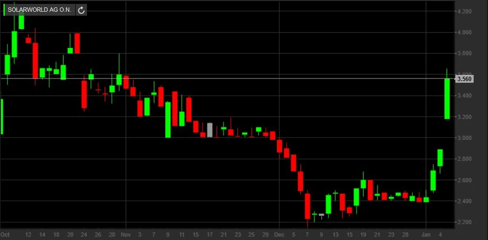 Seit einigen Monaten befindet sich die Solarworld AG in wirtschaftlichen Schwierigkeiten. Dumpingpreise aus China machen auf operativer Ebene Schwierigkeiten. Vor allem aber wegen des Rechtsstreits mit mit Hemlock droht die Insolvenz. Das Bonner Unternehmen wurde Mitte des Jahres von einem US-Gericht zur Zahlung einer Schadensersatzforderung an Hemlock in Höhe von etwa 800 Millionen US-Dollar verurteilt. Derweil läuft die Restrukturierung. Etwa 470 Beschäftigten soll gekündigt worden sein. Der Grund für den starken Kursausschlag heute und gestern kann das allerdings nicht sein.