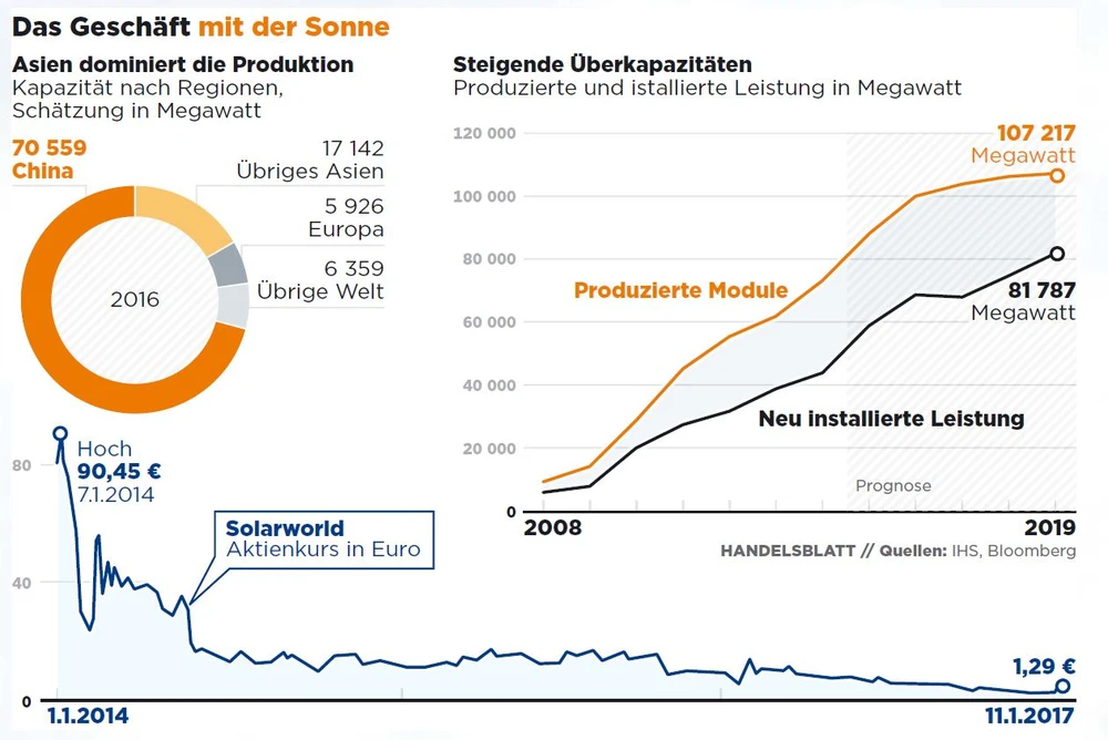 Seit einigen Monaten befindet sich die Solarworld AG in wirtschaftlichen Schwierigkeiten. Dumpingpreise aus China machen auf operativer Ebene Schwierigkeiten. Es drückt eine Schuldenlast in Höhe von xx Millionen Euro. Da die Firma Kreditvereinbarungen (sogenante Covenants)gebrochen hat, könnten die finanzierenden Banken ihre Forderungen fällig stellen. Dabei geht es wohl um 180 Millionen Euro. Nach wie vor in der Schwebe ist das Gerichtsverfahren mit Hemlock, in dem ein US-Gericht US-Gericht Solarworld zur Zahlung von rund 800 Millionen US-Dollar Schdenersatz verurteilt hat. Faktisch droht dem Unternehmen die Insolvenz. 315 Millionen Euro an Nettoschulden plagen die Bonner. Die Konkurrenz aus Asien ist in der Übermacht. Hohe Kapazitäten und sinkende Preise vermiesen den Bonnern das Geschäft.