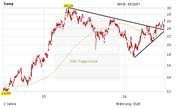 Am Chartbild ist deutlich erkennbar: Die Investoren vertrauen Sony wieder. Das Papier hat den Abwärtstrend geknackt und notiert über der 200-Tage-Linie. Anleger sammeln die Aktie vor dem Verkaufsstart ein. Welche Aktien ebenfalls vom Wachstumsmarkt Virtual Reality profitieren, lesen Sie in der kommenden Ausgabe.