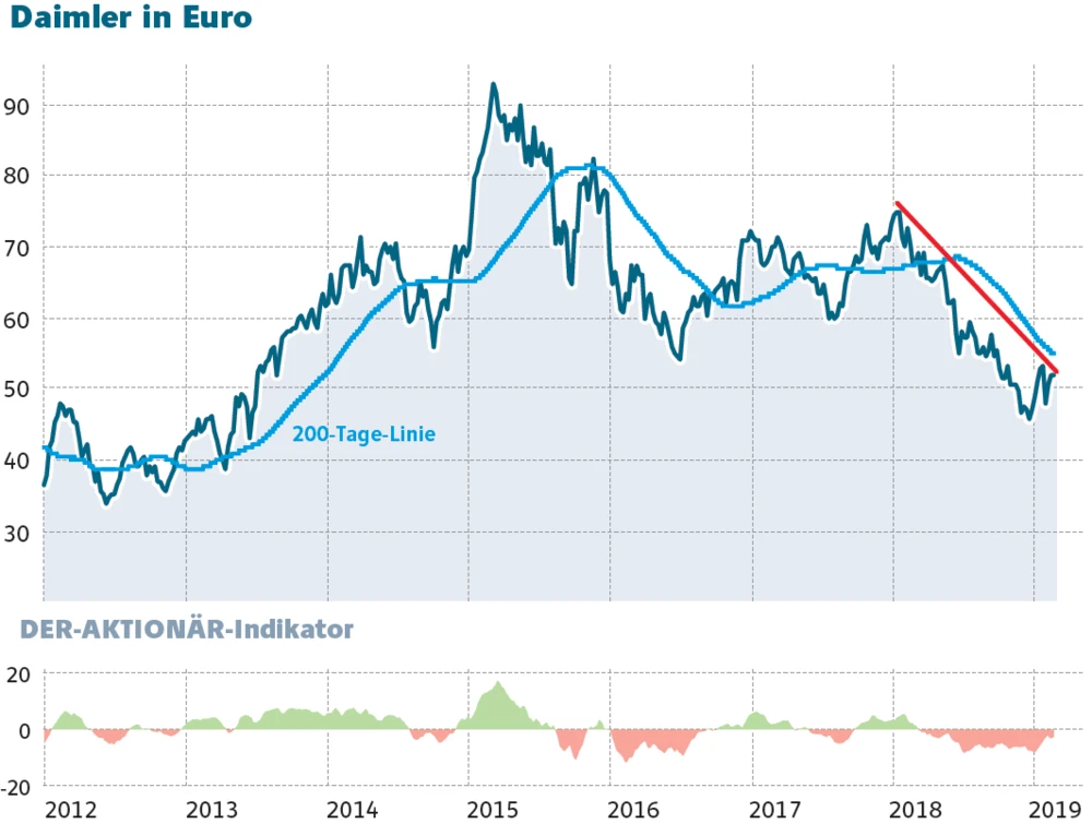 An der Börse läuft es unterdessen nicht besser für den Stuttgarter Autobauer. Der Daimler-Chart sieht nach wie vor angeschlagen aus. Die hohe Dividendenrendite von über sechs Prozent stellt auch kein Kaufargument dar. Ein Kaufsignal würde sich erste ergeben, wenn das Papier den seit einem Jahr anhaltenden Abwärtstrend bei 52,90 Euro nach oben verlässt.