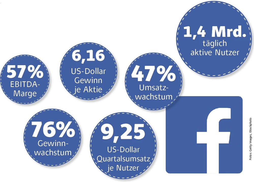 In den USA, dem wichtigsten Markt des Konzerns, sind annähernd 100 Prozent der 24- bis 34-Jährigen auf Facebook aktiv. Im Heimatland des sozialen Netzwerks erlöst Facebook mit jedem der 184 Millionen täglich aktiven Nutzer 34,73 Dollar im Quartal. Weltweit kommt der Konzern dagegen nur auf 9,25 Dollar je Nutzer. Diese große Differenz gibt einen Ausblick darauf, in welchen Regionen der Marktführer noch zulegen kann. Bereits jetzt wächst Facebook nicht mehr in den USA am schnellsten, sondern in Europa. Im vergangenen Quartal stieg der Umsatz dort um 58 Prozent.