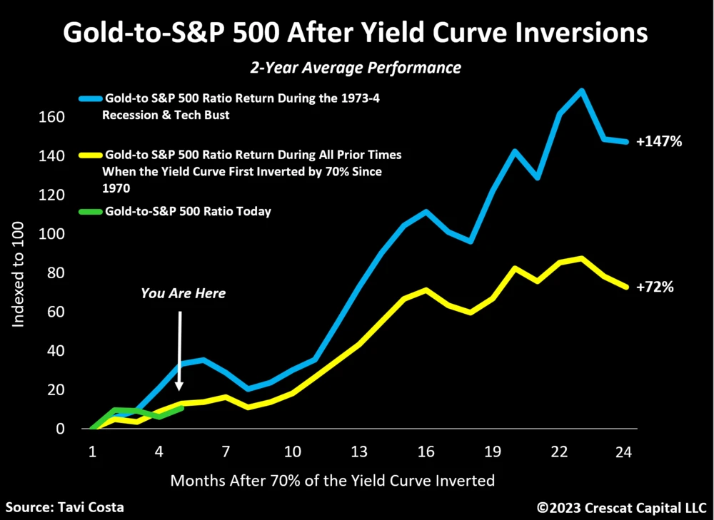 Laut den Indikatoren von Crescat habe es schon im November 2022 ein offizielles Warnsignal gegeben. „Wie die gelbe Linie zeigt, ist zu beachten, dass eine starke Beschleunigung der Rendite ab dem achten Monat einsetzt, was im heutigen Szenario Ende Juli bedeuten würde“, fügte Costa hinzu. Er glaubt, dass angesichts der historisch teuren Finanzanlagen, insbesondere im Vergleich zu Rohstoffen und Gold, sehr wahrscheinlich ist, dass beide Assets funktionieren könnten. Das heißt, Edelmetalle steigen, während die Aktienmärkte fallen.