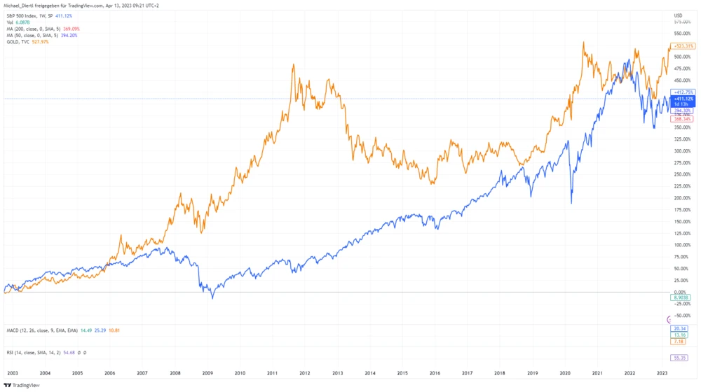 Die Rendite von Gold im Vergleich zum S&P 500 seit dem Platzen der Dotcom-Blase dürfte viele überraschen. Der US-Index legte seit seinem Tief am rund 410 Prozent zu. Der Goldpreis hingegen brachte es im gleichen Zeitraum auf über 520 Prozent. Das Edelmetall war damit über einen Zeitraum von 20 Jahren die deutlich bessere Anlage.
