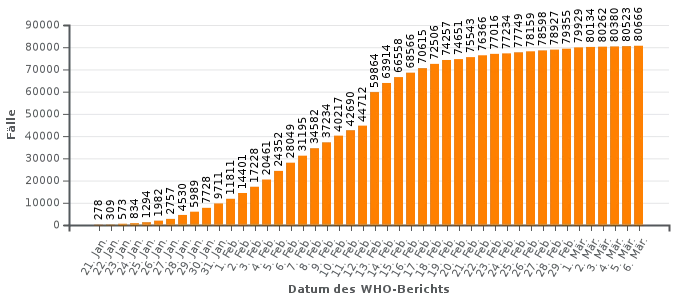 Die Zahl der Todesfälle ist in einer Woche laut WHO auf 3.380 angestiegen. Gemessen an der Zahl der offiziell gemeldeten Erkrankten hat sich damit die Sterberate leicht auf 3,4 Prozent erhöht.