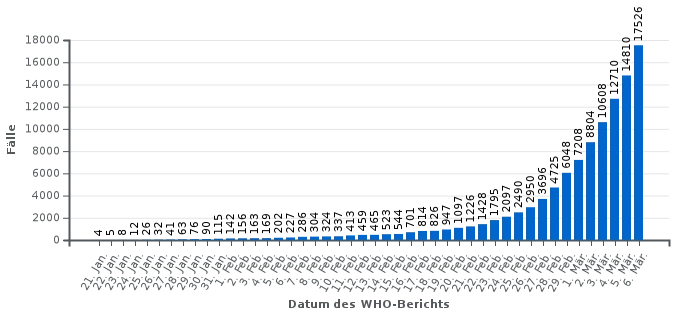 Weltweit ist der Anstieg immer noch exponentiell, liegt aber mit 17.562 erkrankten Fällen im sehr überschaubaren Bereich (siehe Grafiken unten).