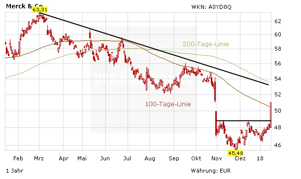 Mit dem Kurssprung hat die Aktie den höchsten Stand seit dem Keytruda-Schock im Oktober erreicht und einen ersten horizontalen Widerstand gebrochen. Dennoch befindet sich das Papier weiter im langfristigen Abwärtstrend. DER AKTIONÄR rät Anlegern, vorerst an der Seitenlinie zu verharren, den Titel aber auf der Watchlist zu haben.
