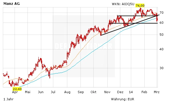 Die Manz-Aktie ist kein Schnäppchen. Angesichts der Apple- und (mit Abstrichen) Tesla-Fantasie ist die Bewertung der Firma mit dem einfachen Jahresumsatz jedoch angemessen. Auch sinkt das KGV von jetzt 24 bis 2015 auf 12. Die laufende AKTIONÄR-Empfehlung bleibt ein spannendes Investment. Kurzfristig hat sich die Charttechnik jedoch etwas eingetrübt.