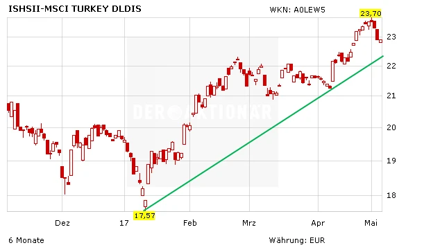 Auf ein Weiterlaufen der Türkei-Rallye unter Präsident Erdoğan lässt sich mit dem iShares MSCI Turkey ETF (WKN: A0LEW5) spekulieren. Die Chancen auf lukrative Renditen sind da, entsprechend hoch ist aber auch das Risiko.