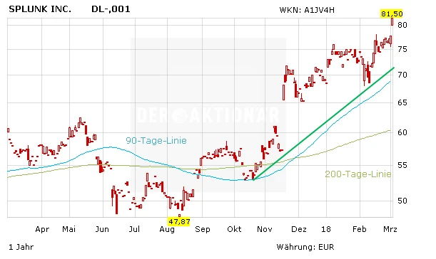 Das vergangene Geschäftsjahr schloss Splunk stark ab. Die Erlöse stiegen im vierten Quartal um 37 Prozent auf 419,7 Millionen Dollar bei einem Verlust je Aktie von 0,18 Dollar. Im laufenden Geschäftsjahr dürfte Splunk diesem Wachstumstrend weiter folgen und sogar einen positiven Nettoertrag aufweisen.