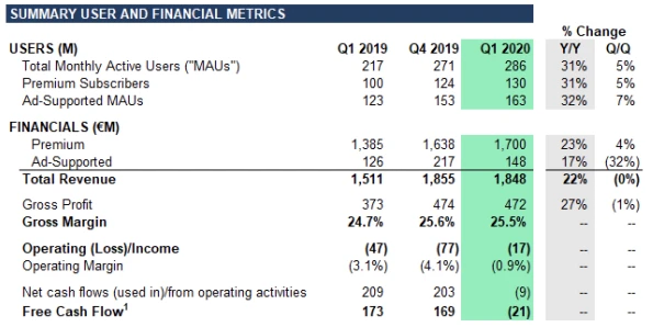 Im zweiten Quartal erwartet Spotify Umsätze in Höhe von 1,75 bis 1,95 Milliarden Dollar (Konsensschätzung: 2,02 Milliarden Dollar). Für das Geschäftsjahr 2020 korrigiert das Unternehmen seine bisherige Umsatzerwartung von 8,08 bis 8,48 Milliarden Dollar wegen Werbeeinbußen nach unten. Der Jahresumsatz soll nur noch zwischen 7,65 und 8,05 Milliarden Euro liegen (Schätzung: 8,19 Milliarden Dollar).