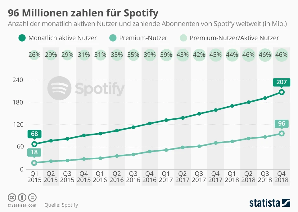 Für Spotify ist Nutzerwachstum die wohl wichtigste Kennzahl. Sicherlich zahlen nicht alle der 207 Millionen monatlich aktiven Nutzer für den Streaming-Dienst, denn ein Großteil nutzt Spotify kostenlos und bekommt stattdessen Werbung eingeblendet. Ein essentieller Bestandteil der Freemium-Strategie von Spotify, denn sie setzt darauf, dass aus einfach zu erreichenden Free-Usern irgendwann einmal Paid-User werden.