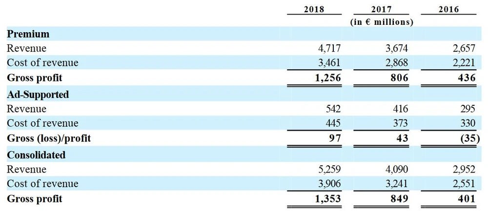 Vergleicht man die Nutzergruppen miteinander, erhält man weitere Einblicke in die Qualität des Nutzerwachstums von Spotify. Denn mit den Premium-Nutzern erzielte der Konzern 2018 einen Umsatz von 4,72 Milliarden Euro bei einem Bruttogewinn von 1,26 Milliarden Euro. Zum Vergleich: Mit den werbe-unterstützten Nutzern erwirtschafteten die Schweden im gleichen Zeitraum nur 542 Millionen Euro bei einem Bruttogewinn von 97 Millionen Euro.