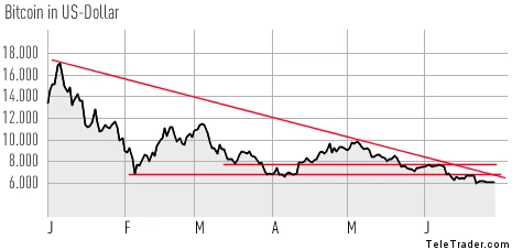 Aus charttechnischer Sicht besteht Hoffnung, dass wir nun die ersehnte Bodenbildung sehen und mit einem nachhaltigen Ausbruch aus dem mittelfristigen Abwärtstrend endlich wieder positives Momentum aufkommt. Doch selbst dann wird es ein harter Weg zurück nach oben: Im Bereich von 6.800 und 7.700 Dollar warten bereits zwei massive Widerstände, die es erst einmal zu überwinden gibt. Was die den nötigen Schwung für diesen Kraftakt bringen könnte, ist derzeit offen – die Vergangenheit zeigt aber, dass der Kryptomarkt immer wieder für Überraschungen und spontane Kurssprünge gut ist.