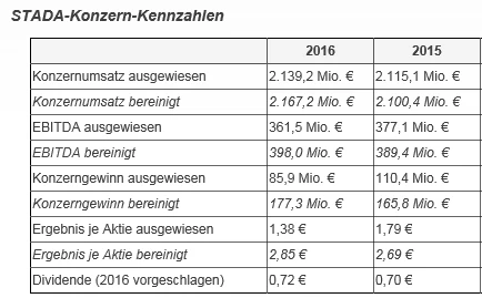 Der Arzneimittelhersteller STADA hat nach der vor Kurzem angekündigten Neubewertung einer Transaktion seine Geschäftszahlen für das vergangene Jahr angepasst: Umsatz und bereinigte Gewinn stiegen nun weniger stark, als Anfang März mit den Eckdaten in Aussicht gestellt worden war. 2016 konnte STADA nach revidierten Zahlen seinen Umsatz im Vergleich zum Vorjahr um ein Prozent auf 2,14 Milliarden Euro erhöhen. Unter dem Strich blieben aber nur 85,9 Millionen Euro an Gewinn – nach 110,4 Millionen Euro im Vorjahr. Positiv jedoch: Der MDAX-Konzern hält an seiner Prognose für 2017 und den erst kürzlich angehobenen Zielen für 2019 fest. Bis dahin will STADA 2,65 bis 2,7 Milliarden Euro Umsatz und 250 bis 270 Millionen Euro Gewinn erzielen. Geplant ist außerdem, bis dahin vier große Biosimilars-Nachahmerprodukte für biotechnologisch hergestellt Arzneimittel am Markt einzuführen. Zudem sollen mindestens sieben neue Markenprodukte in die internationalen Märkte gebracht werden. Im Rahmen dieser Produktoffensive will STADA dabei zum zum "Besten seiner Klasse" werden, sagte Vorstandschef Matthias Wiedenfels.