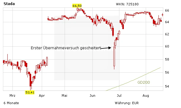 Was für ein Hin und Her bei der geplanten Übernahme des deutschen Arzneimittelherstellers STADA. Der erste Versuch der Finanzinvestoren Bain und Cinven zu einem Übernahmepreis von 66 Euro je Aktie war wegen zu geringer Andienung gescheitert. Nachdem man die Mindestannahmeschwelle bereits von ursprünglich 75 Prozent auf 67,5 Prozent gesenkt und die Angebotszeit verlängert hatte, fehlten am Ende dennoch knapp zwei Prozent. Kurz darauf starteten Bain und Cinven einen zweiten Versuch. Diesmal mit einem Gebot von 66,25 Euro je Aktie und einer Annahmeschwelle von 63 Prozent, die bis zum 16. August erreicht werden sollte. Zunächst sah es danach auch, als sollte auch der neue Vorstoß zum Scheitern verurteilt sein. Bis zum Mittwochmittwoch hatten sich Bain und Cinven lediglich 46,53 Prozent der STADA-Anteile gesichert. Es fehlten also zu dem Zeitpunkt noch rund 16,5 Prozent.