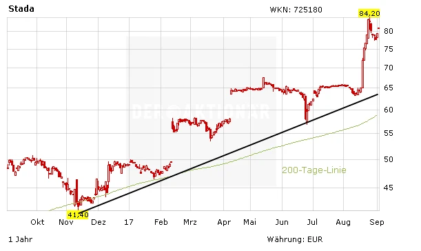 Hedgefonds Elliott, unter der Leitung von Paul Singer hat es geschafft: Das Investorenduo Bain Capital und Cinven sind bereit, für alle ausstehenden STADA-Aktien den geforderten Preis von 74,40 Euro zu zahlen. Singers Spekulation geht damit auf. Vorbörslich legen die MDAX-Titel rund vier Prozent auf 82,50 Euro zu.