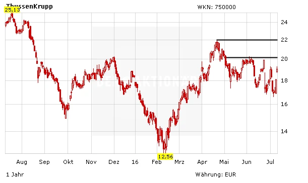 Die Fusion mit Tata wäre ein wichtiger Schritt, um sich in Zukunft vermehrt auf die Technologiesparte konzentrieren zu können. Am Ende könnte der Konzern dazu auch den Verkauf von Steel America anstoßen und so die gesamte Stahlsparte abstoßen. Noch ist das alles graue Theorie. Aber allein die Spekulationen zu dem Thema sorgen immer wieder für deutliche Impulse. Risikobewusste Anleger können daher einen ersten Fuß in die Tür stellen. Aus charttechnischer sicht warten die nächsten widerstände bei 20 und 22 Euro.