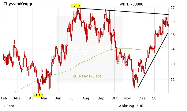 Lediglich die Papiere von ThyssenKrupp hinken am Mittwoch etwas hinterher. Die Märkte warten hier gespannt auf das Ergebnis der Abstimmung der Mitarbeiter über die Stahlfusion. Anleger sollten aber kein Stück aus der Hand geben. Die Aktie steht vor einer Neubewertung, auch Kurse über 30 Euro könnten dann möglich sein.