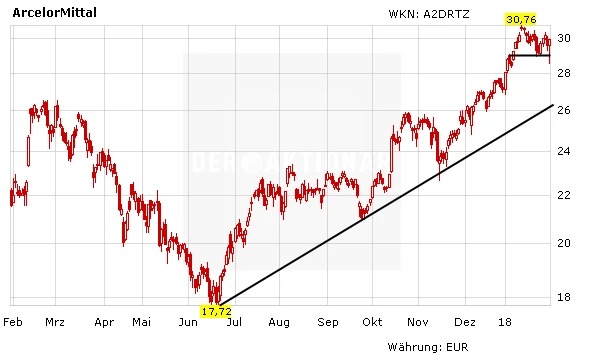 Aufgrund der etwas niedrigeren Dividende war die ArcelorMittal-Aktie am Morgen in die Knie gegangen. Inzwischen haben sich die starken Zahlen aber zu Recht durchgesetzt und die Aktie ist ins Plus gedreht. Die Aussicht auf steigende Stahlpreise sollte den nach wie vor günstig bewerteten Titel weiter antreiben. Anleger können nach wie vor zugreifen.