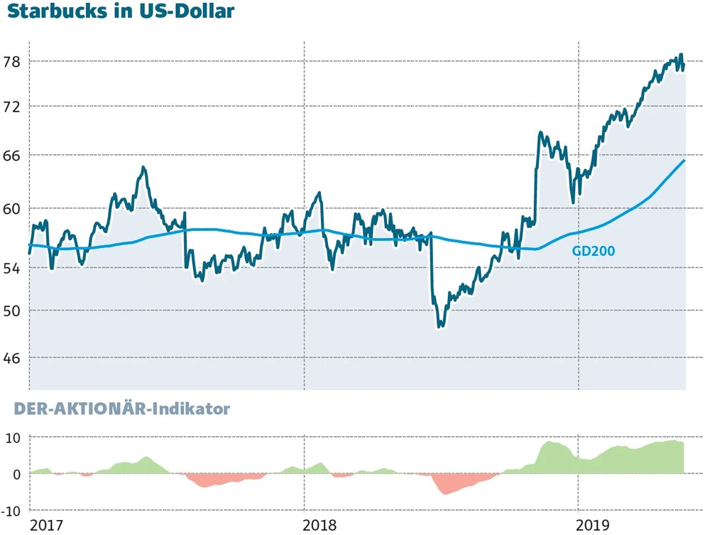 Nach den jüngsten Quartalszahlen konnte die Starbucks-Aktie ihren Aufwärtstrend nochmals beschleunigen. Die Kaffeehauskette hat in den ersten drei Monaten des Jahres ihren Umsatz um über fünf Prozent auf 6,3 Milliarden Dollar gesteigert. Der Gewinn legte von 660 auf 663 Millionen Dollar zu. An diesem starken Ergebnis lässt Starbucks auch seine Aktionäre teilhaben und schüttet eine Quartalsdividende von 0,36 Dollar je Aktie aus. Auf das Jahr hochgerechnet werden somit 1,44 Dollar je Anteilschein bezahlt, das entspricht einer Rendite von rund 1,9 Prozent.