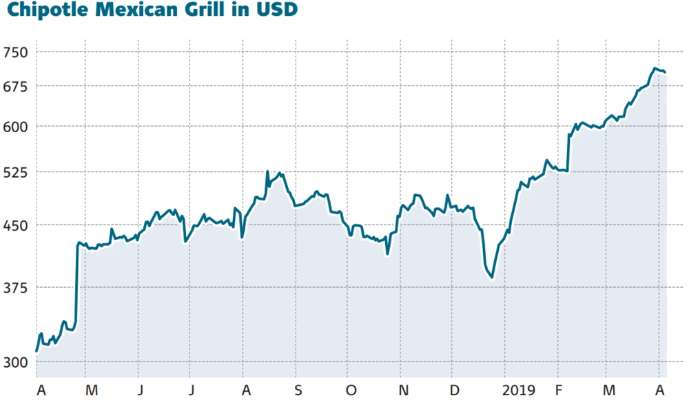 Durch einen Austausch mehrerer Vorstands- und Managementpositionen ist CMG jetzt wieder auf dem richtigen Weg. Besonders hervorzuheben ist in diesem Kontext der neue CEO Brian Niccol, der als ehemaliger CEO von Taco Bell einen großen Zugewinn für CMG darstellt. Dass seine neue Strategie funktioniert, ist vor allem daran ersichtlich, dass die einzelnen Fialen im vierten Quartal 2018 ihren Umsatz im Mittel um mehr als sechs Prozent steigern konnten. Auch der Aktienkurs ist seit Jahresbeginn um fast 68 Prozent gestiegen.
