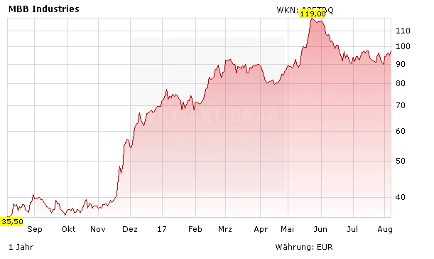 MBB hat nach vorläufigen Zahlen im ersten Halbjahr 2017 einen Rekordumsatz in Höhe von 193,9 Millionen Euro erzielt. Dies entspricht einem Umsatzwachstum von 21,7 Prozent. Das Ergebnis je Aktie erreichte 1,26 Euro (Vorjahr: 1,09 Euro). Die gute Entwicklung in allen Tochterfirmen der MBB Gruppe untermauert nach Ansicht des Managements die Prognose eines Umsatzes von 390 Millionen Euro und eines Ergebnisses von mindestens 2,16 Euro pro Aktie im Gesamtjahr 2017. Ein insgesamt recht konservativer Ausblick. Die Aktie kratzt am horizontalen Widerstand bei 98 Euro. Dieser sollte aber schon in Kürze überwunden werden – und die Papiere dann schnell in dreistellige Kursregionen vorstoßen.
