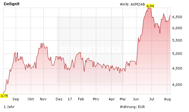 AKTIONÄR-Altempfehlung Delignit hat im ersten Halbjahr 2017 den Umsatz und das Ergebnis deutlich gesteigert. Zur Erinnerung: Delignit entwickelt, fertigt und vertreibt ökologische, überwiegend laubholzbasierte Werkstoffe und Systemlösungen. Das Unternehmen ist anerkannter Entwicklungs- und Projektpartner sowie Serienlieferant für Technologiebranchen wie etwa der Automobil- und Schienenverkehrsindustrie. Mit den guten Zahlen hat der Vorstand die Jahresprognose bestätigt und geht von einem Umsatzanstieg um zehn bis 15 Prozent bei einer EBITDA-Marge zwischen 7,5 bis 8,3 Prozent aus.