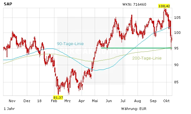 Rund zehn Prozent ging es nach Erreichen des Allzeithochs bei 108,42 Euro nach unten. Die Aktie von SAP stoppte erst bei der 200-Tage-Linie ihre Kursverluste. Aktuell verläuft der wichtige Gleitende Durchschnitt bei 95,34 Euro. Doch die 200-Tage-Linie ist nicht die einzige Marke die im kurzfristigen Abwärtstrend die Kurse stützt: So markiert der Bereich um 95,00 Euro eine weitere Unterstützungszone.