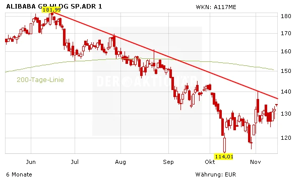 Die Aktie von Alibaba kann seit dem Tencent-Report um 2,3 Prozent gewinnen und steht damit kurz vor dem Bruch des Abwärtstrends