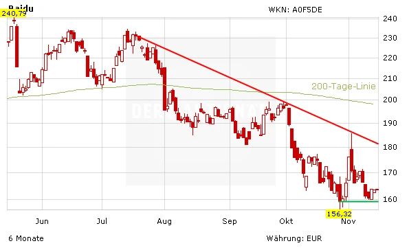 Baidu legt ein Prozent zu. Zudem hat sich eine horizontale Unterstützung ausgebildet. Der langfristigen Abwärtstrend ist jedoch noch weit entfernt.