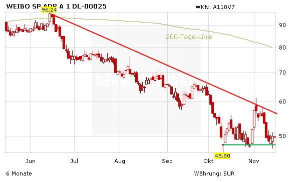 Weibo kann sogar drei Prozent zulegen. Doch der Abwärtstrend bleibt auch hier intakt. Es wird an einer Bodenbildung im Bereich 54 Dollar gearbeitet.