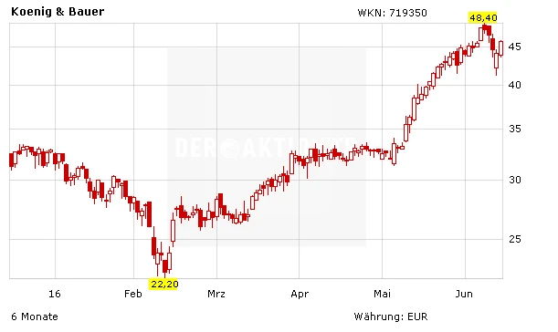 KBA dürfte mit der Konzentration auf die gewinnbringendsten Bereiche wieder nachhaltig schwarze Zahlen schreiben und die Marge kontinuierlich verbessern. Nachdem vor zwei Jahren noch eine magere EBIT-Marge von 1,3 Prozent erzielt wurde, liegen im kommenden Jahr bereits über sechs Prozent im Rahmen des Möglichen. Für zusätzliche Impulse hat die Drupa gesorgt, mit deren Verlauf die Würzburger sehr zufrieden waren.