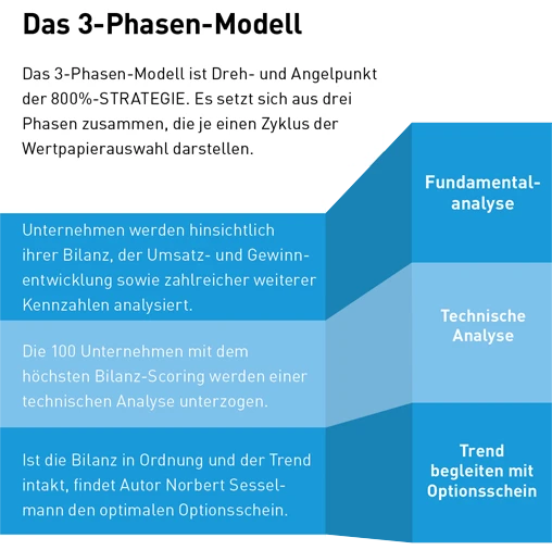 Die 800%-STRATEGIE basiert auf dem sogenannten 3-Phasen-Modell. Entwickelt von AKTIONÄR-Redakteur und TSI-Experte Norbert Sesselmann, stellt das Modell sicher, dass Sie ausschließlich in die besten Unternehmen der Welt investieren. In Phase 1 werden die Unternehmen einem Bilanz-Check unterzogen. Ist diese Fundamental-Analyse abgeschlossen und der Bilanz-Scoring-Wert ermittelt, werden diejenigen mit den höchsten Werten einer technischen Analyse unterzogen. Mithilfe des eigens für die 800%-STRATEGIE entwickelten AKTIONÄR-Indikators wird geprüft, ob die Aktien dieser Unternehmen stabile Aufwärtstrends aufweisen. Je höher der Indikator-Wert, desto stärker und nachhaltiger der Trend. Und desto besser die Aussichten auf eine Fortsetzung. Dann folgt Phase 3: Ist die Bilanz in Ordnung und der Trend intakt , findet Norbert Sesselmann den optimalen Optionsschein, mit dem Sie die Rallye begleiten und gleichzeitig ihre Rendite vervielfachen können. So wie im Fall von Visa. So wie bei Continental (+324 Prozent!) und bei vielen weiteren Werten. So aufwendig das Auswahlverfahren, so einfach der Grundgedanke dahinter: