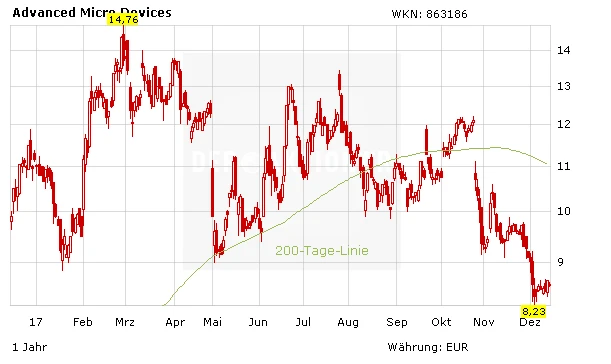 Abzuwarten bleibt, ob die Umsatzanstiege auch in den kommenden Quartalen anhalten. Die erste Euphorie über den neuen Produktzyklus und die dadurch eroberten Marktanteile ebbte zuletzt deutlich ab, wie sich am Kursverlauf der AMD-Aktie nachvollziehen lässt. Von ihrem Hoch von 15,65 Dollar am 26.Juli 2017 folgte ein Kursrutsch bis auf aktuell 10,11 Dollar.