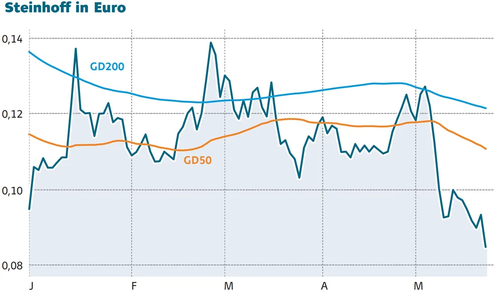 Die Steinhoff-Aktie erholt sich am Freitag leicht von den schweren Kursverlusten vom Donnerstag. Auf Xetra war der Titel um 5,4 Prozent auf 0,0848 Euro eingebrochen. Am 18. Juni will Steinhoff die Bilanz für 2018 vorlegen. Fällt sie schwächer aus als erwartet, droht ein weiterer Einbruch. Dann könnte es schnell in Richtung Rekordtief bei 0,071 Euro gehen.