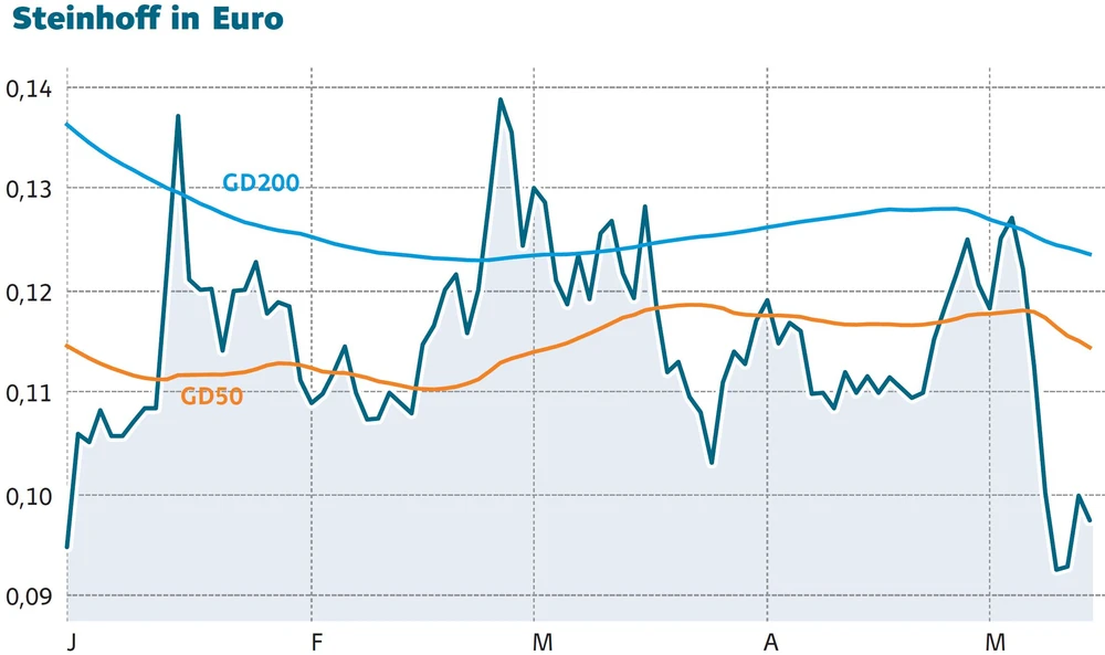 Die Steinhoff-Aktie wird an der Börse weiterhin rauf- und runter gezockt. Nach einer technischen Gegenbewegung geht es am Mittwoch wieder abwärts. Am Nachmittag verliert der Titel zwei Prozent und rutscht wieder unter die Marke von 10 Cents. Wie es weitergeht, hängt zum großen Teil von diesen Terminen ab.