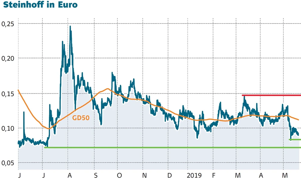 Ein Break nach oben würde indes erst beim Überwinden der 15-Cent-Marke gelingen. Diesen Wert erreichte Steinhoff im Februar. Aus rein charttechnischer Sicht wäre dann Platz bis zum Hoch vom Juli 2018 bei 0,247 Euro.