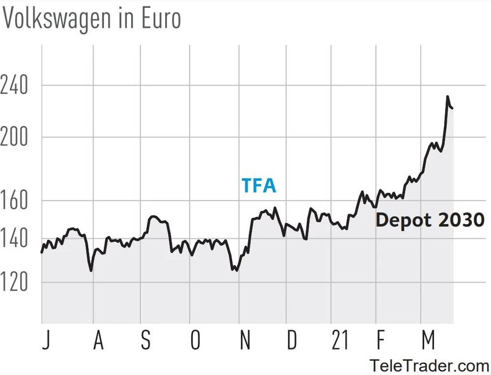 Hinweis: Volkswagen befindet sich mit einem Plus von 40 Prozent im erfolgreichen Depot 2030 des AKTIONÄR Hot Stock Report. Gerade gab es wie bei VW ein weiteres TFA-Signal für eine DAX-Aktie. Mehr zu dieser neuen E-Auto-Empfehlung lesen Sie im neuen Report. Einfach hier freischalten und ab sofort alle Transaktionen frühzeitig per Mail und SMS erhalten.