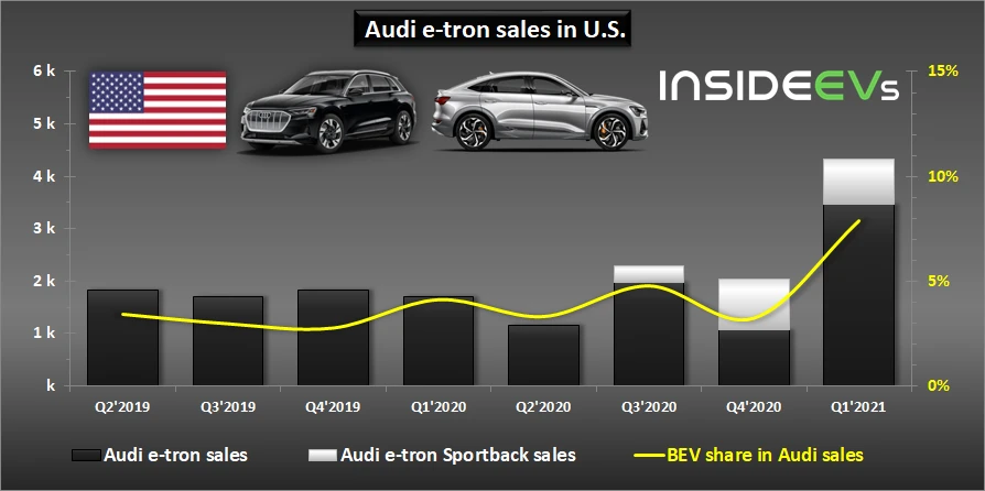 Nicht nur der Erfolg der Porsche-Marke sorgt für Rückenwind der Volkswagen-Aktie. Auch die Tochter Audi entwickelt sich überraschend gut. Kurz nachdem der E-Auto-Pionier Tesla die Verdopplung seines Absatzes im ersten Quartal 2021 gemeldet hatte, zeigt auch Audi rasantes Wachstum. Mitten im Heimatmarkt von Tesla wurden in den ersten drei Monaten 2021 mit 4.324 Einheiten sogar 150-Prozent mehr Audi-e-tron als im gleichen Vorjahreszeitraum verkauft. Gut veranschaulicht diese neue VW-Dynamik die Grafik von insideevs.com.