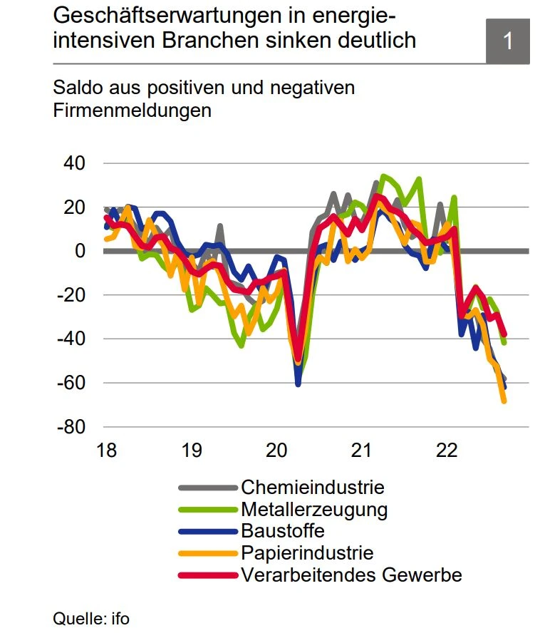 Deutschland im Rückwärtsgang: „Die Produktion im Verarbeitenden Gewerbe dürfte 2022 um 2,5 Prozent und im Jahr 2023 um rd. 5 Prozent schrumpfen.“ Die Gaspreisbremse mildere die Folgen zwar ab. Doch es würde den Staat finanziell überfordern, wenn er auch mittelfristig die Energiepreise für industrielle Endkunden (vor allem Gas) spürbar subventionieren wolle.