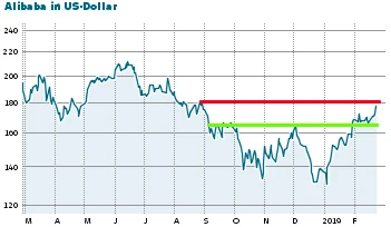Im Fokus der Anleger stehen nun Aktien wie die von Alibaba. Der E-Commerce-Riese hat nach starken Q4-Zahlen bereits einen guten Start ins neue Börsenjahr hingelegt, notiert bei 177 Dollar jedoch weiter deutlich unter den Hochs von 2018 (211 Dollar). Kurzfristig rückt der Widerstand bei 180 Dollar in den Mittelpunkt (rote Linie), ein Break könnte das Papier anschließend schnell bis auf 200 Dollar treiben.