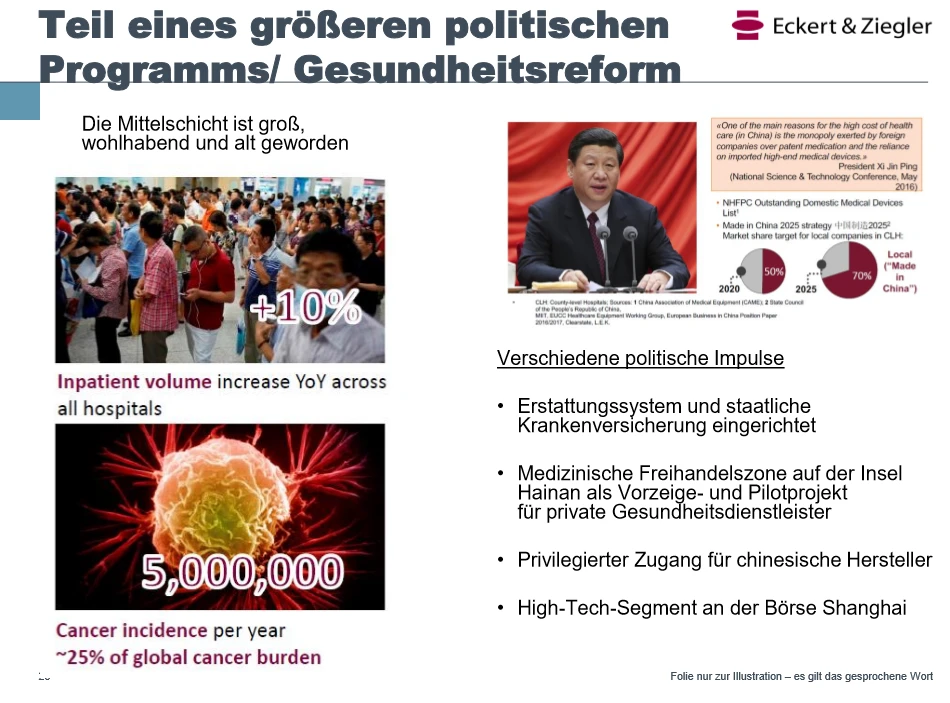 Eckert & Ziegler ist ein Anbieter von Spezialkomponenten für Strahlentherapie und Nuklearmedizin. Viel Potenzial sehen die Berliner in China. Der Gesundheitsmarkt im Reich der Mitte erwache, heißt es in einer Unternehmenspräsentation.