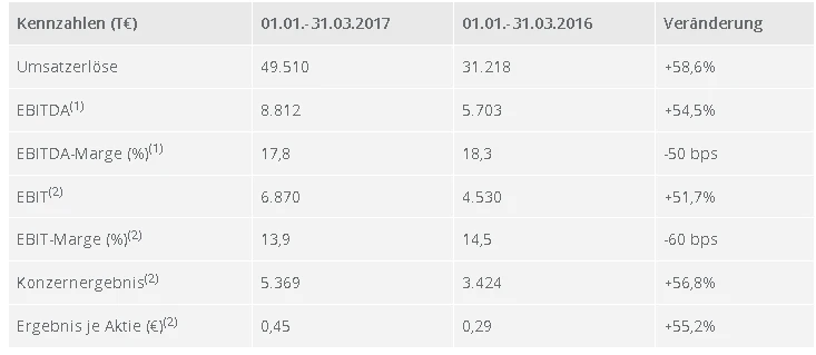 Beim Umsatz konnte Stratec Biomedical ein Anstieg von 58,6 Prozent im Vergleich zum Vorjahreszeitraum verbuchen. Hauptverantwortlich für dieses Wachstum sind Akquisitionen, die im ersten Quartal 2016 noch nicht zur Stratec-Gruppe gehörten. Ohne die Übernahmen schraubte das Unternehmen seine Erlöse um 21,1 Prozent nach oben.
