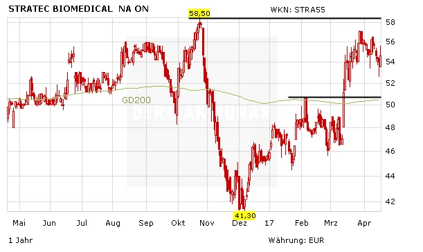 Stratec Biomedical hat am heutigen Donnerstag die endgültigen Zahlen für das vergangene Geschäftsjahr vorgelegt und damit das starke Ergebnis der vor einigen Wochen veröffentlichten vorläufigen Zahlen bestätigt. Der Umsatz kletterte um 25,9 Prozent auf 184,9 Millionen Euro. Der Überschuss vor Zinsen und Steuern kletterte von 26,9 Millionen Euro auf 32,3 Millionen Euro. Unter dem Strich erhöhte sich der Gewinn von 1,87 Euro je Aktie auf 2,14 Euro pro Anteil. Neben der deutlichen Steigerung der Umsatzerlöse und des erwirtschafteten Ertrags konnte sich das Unternehmen auch strategisch deutlich verstärken. Neben dem Ausbau des Entwicklungsteams, der als eine Voraussetzung zur Durchführung zahlreicher anstehender Entwicklungsprojekte dient, wurden weitere bedeutende Geschäftsbereiche durch zwei Akquisitionen erschlossen. Der am 14. Juni 2017 stattfindenden Hauptversammlung wird die bereits dreizehnte Dividendenerhöhung in Folge vorgeschlagen. Je Aktie sollen die Anleger 0,77 Euro erhalten. Das entspricht einer Rendite von 1,4 Prozent.