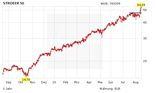 Der SDAX-Titel Ströer befindet sich weiter im Höhenflug. Auch nach dem heute markierten Rekordhoch bei 53,29 Euro besitzt die Aktie noch Luft nach oben.