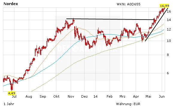 Jede kurze Schwächphase bei Nordex wird derzeit mit Käufen beantwortet. Auch in einem uneinheitlichen Marktumfeld klettert das Papier weiter.