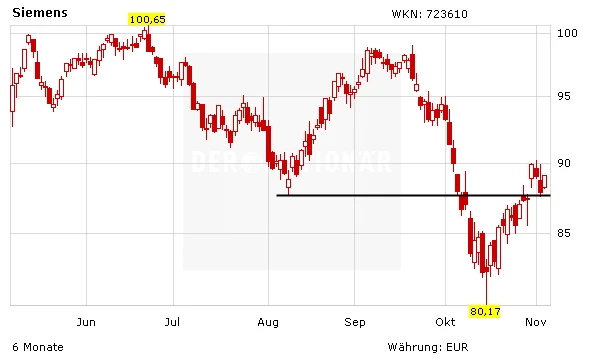 In den letzten Tagen konnte die Siemens-Aktie bereits deutlich zulegen. Das Unternehmen hat in einigen Bereichen, wie der Sparte für Windenergie seine Probleme. Langfristig dürfte aber die Strategie von Siemens-Chef Joe Kaeser aber Früchte tragen. Aktionäre profitieren bei dem DAX-Konzern zudem von einer Dividendenrendite von 3,6 Prozent. Investierte Anleger bleiben daher dabei und sichern ihre Position mit einem Stopp bei 80 Euro ab.