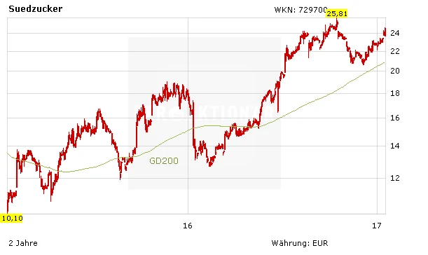 Während die Analysten gespaltener Meinung sind, sind die Anleger zuversichtlich: Die Commerzbank hat das Kursziel für Südzucker nach Zahlen zum dritten Geschäftsquartal von 26,50 auf 27,00 Euro angehoben und die Einstufung auf "Buy" belassen. Die starken Kennziffern und der erneut angehobene Ausblick hätten seine positive Einschätzung des Zuckerproduzenten untermauert, so Analyst Michael Schäfer in einer Studie. Warburg Research hingegen empfiehlt die Aktie von Südzucker weiter zum Verkauf. Das Kursziel wurde bei 18,10 Euro belassen. Analyst Oliver Schwarz rechnet in der zweiten Jahreshälfte mit zunehmendem Margendruck. Die Aktie gewinnt derweil zum Wochenstart mehr als drei Prozent und ist damit der zweitstärkste Wert im MDAX des Tages hinter Hugo Boss. Aus charttechnischer Sicht dürfte das Zwischenhoch vom Oktober vergangenen Jahres bei 25,81 Euro eine größere Hürde darstellen. AKTIONÄR-Leser lassen ihre guten Gewinne seit der Empfehlung weiter laufen, sichern sich aber mit einem Stopp bei 19,80 Euro ab.