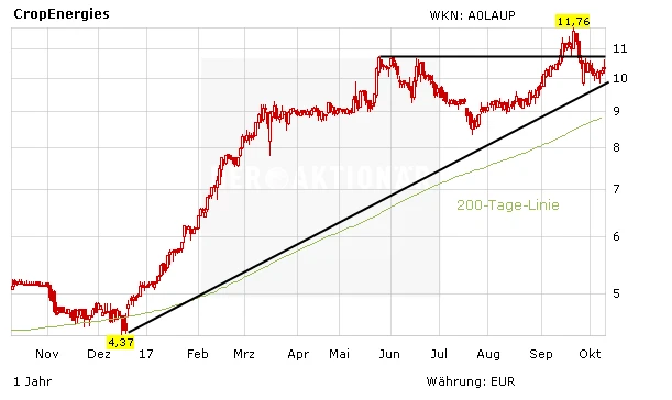 Stand jetzt brummt das Geschäft von Cropenergies. Die Aktie zog im vorbörslichen Handel um rund fünf Prozent an, gab diese Gewinne allerdings im bisherigen Tagesverlauf wieder ab. Für investierte Anleger besteht kein Handlungsbedarf. Unverändert hält DER AKTIONÄR an dem Kursziel von 13 Euro für die Südzucker-Tochter fest mit Stopp bei 8,90 Euro.